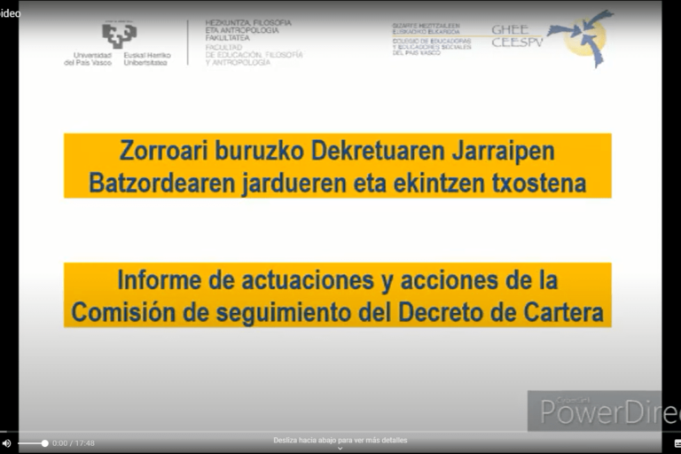 Se centra en el trabajo de análisis y reflexión sobre los servicios del decreto de cartera de Servicios y Prestaciones del GV, así como, la socialización de los contenidos del mismo a las personas colegiadas, a la comunidad universitaria (decanato, profesorado y alumnado) y también a la administración a través de diferentes acciones o producciones de aporte técnico: documentación, artículos, cuestionario, videos, notas informativas…
